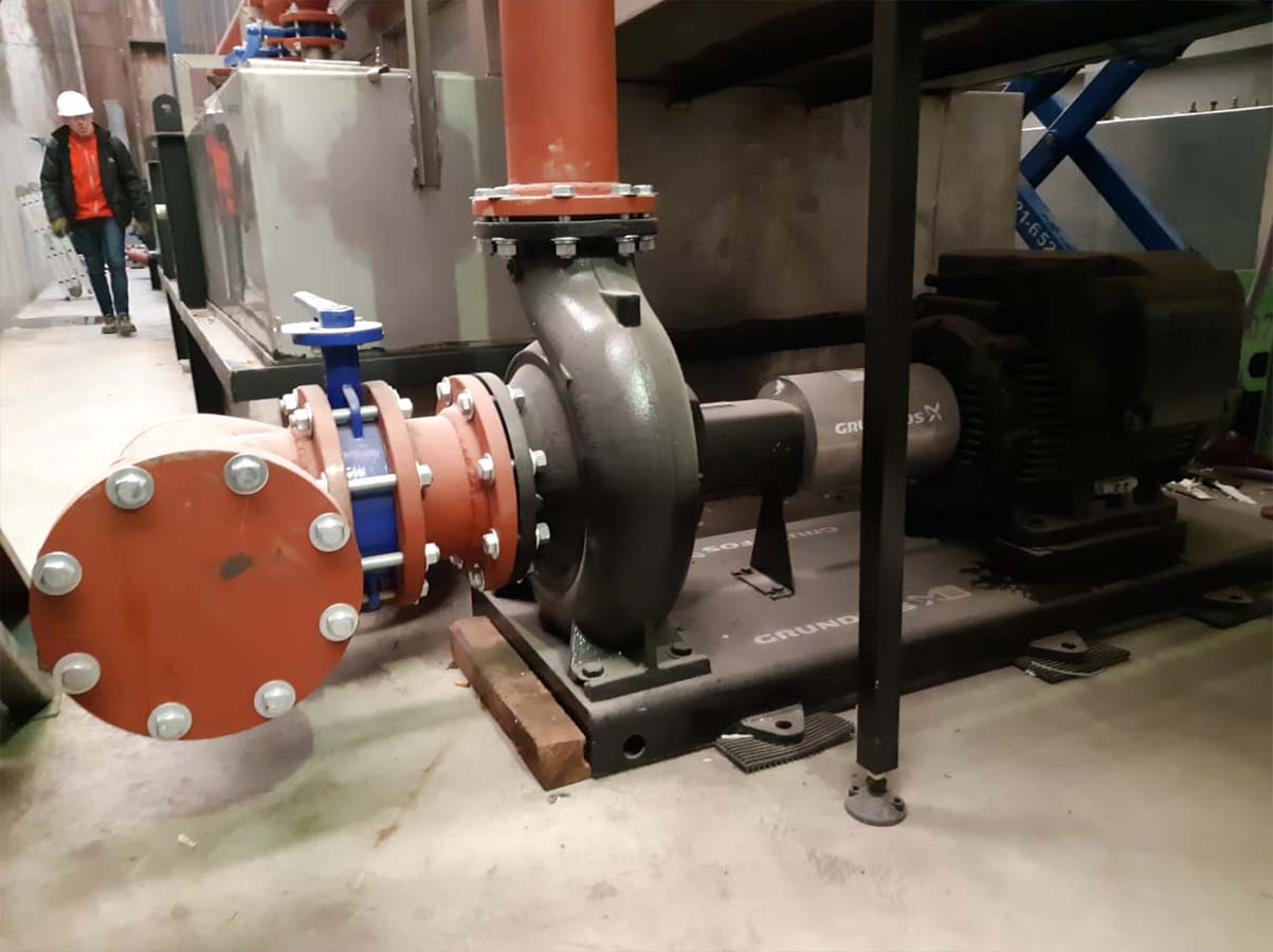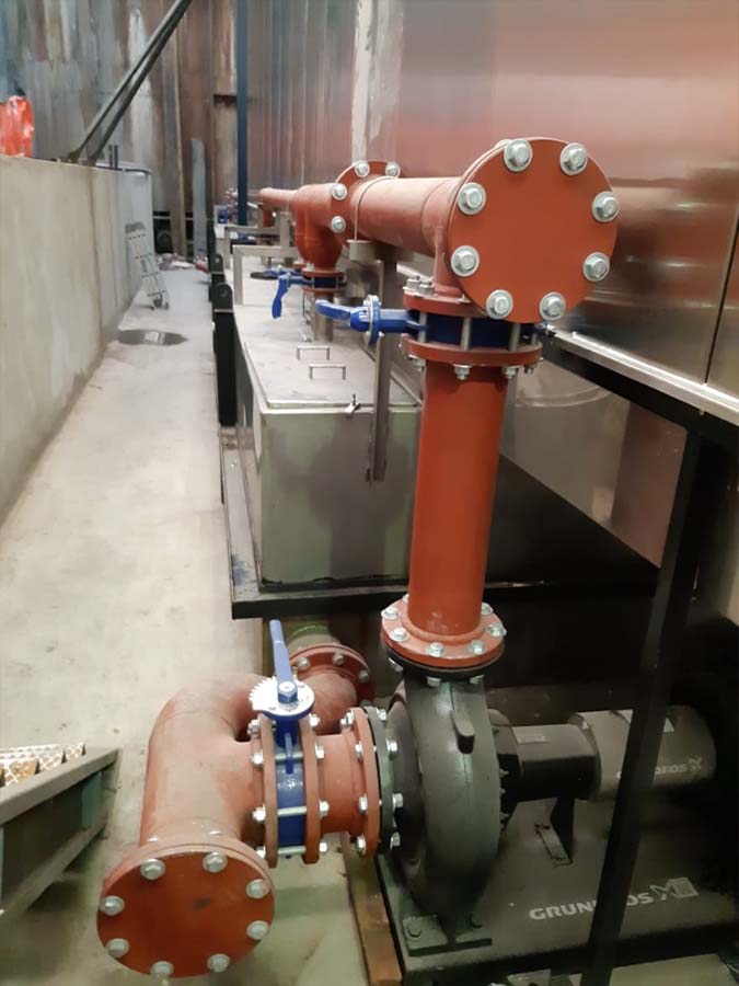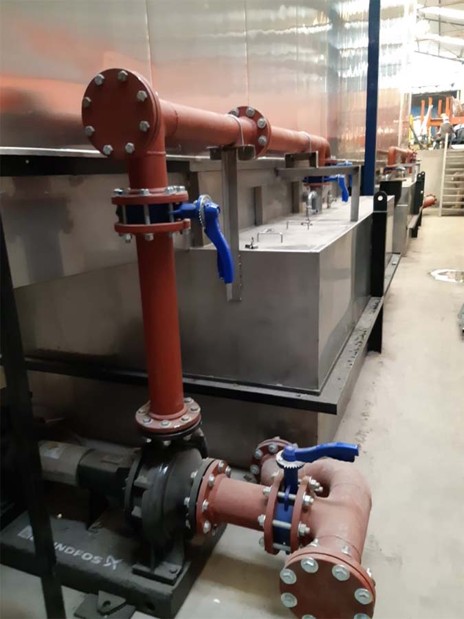 Túnel de pretratamiento para fabricante de estructuras metálicas. Con cuatro etapas de trabajo: Desengrase, enjuague, fosfatizado y enjuague final.